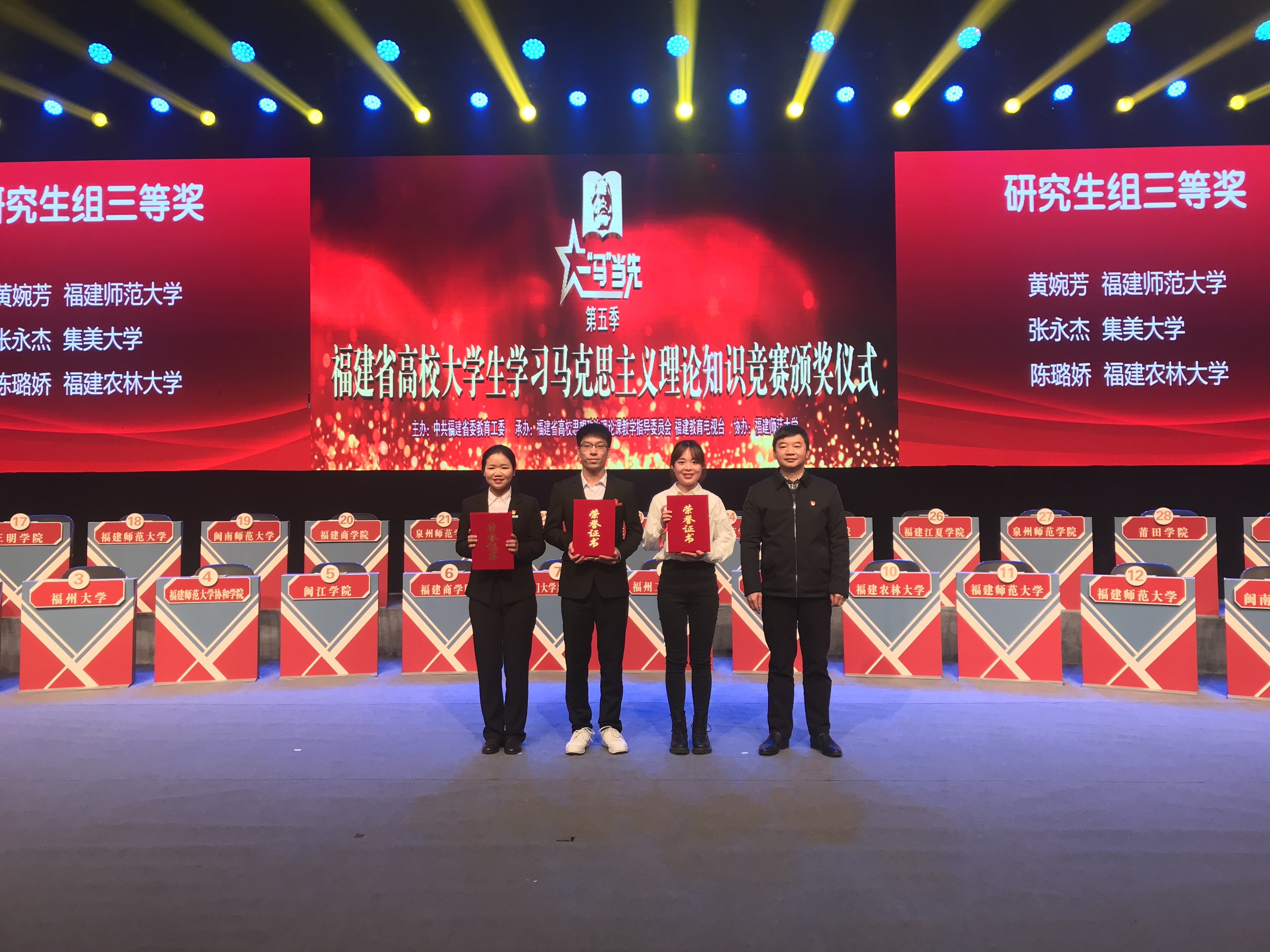 12月20日,由中共福建省委教育工委主办,福建省高校思想政治理论课教学指导委员会和福建教育电视台承办的第五季福建省高校大学生学习马克思主义理论“一‘马’当先”知识竞赛总决赛在福州举行,经过必答环节和淘汰环节的比拼,我校2019级马克思主义中国化研究专业张永杰获得研究生组个人三等奖。