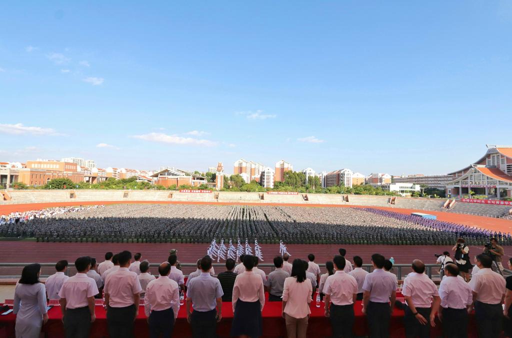 10月11日下午,我校2020级新生齐聚庄重文夫人体育场参加新生开学典礼暨军训动员大会。校领导沈灿煌、李清彪、郑志谦、洪文建、童建福、于洪亮、曹敏杰,中国工程院院士赵振业,31614部队副部队长曾勇,相关部处负责人、各学院领导、全体承训教官及2020级新生参加大会。大会由副校长曹敏杰主持。