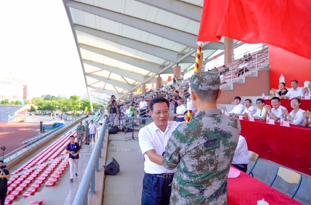 校党委书记沈灿煌向承训部队教官授予集美大学军训团团旗,主席台领导为2020级新生代表佩戴校徽、赠送《陈嘉庚精神读本》。