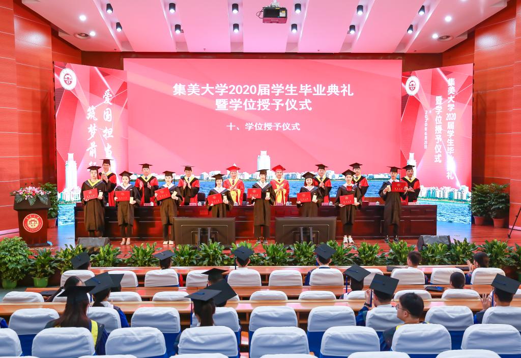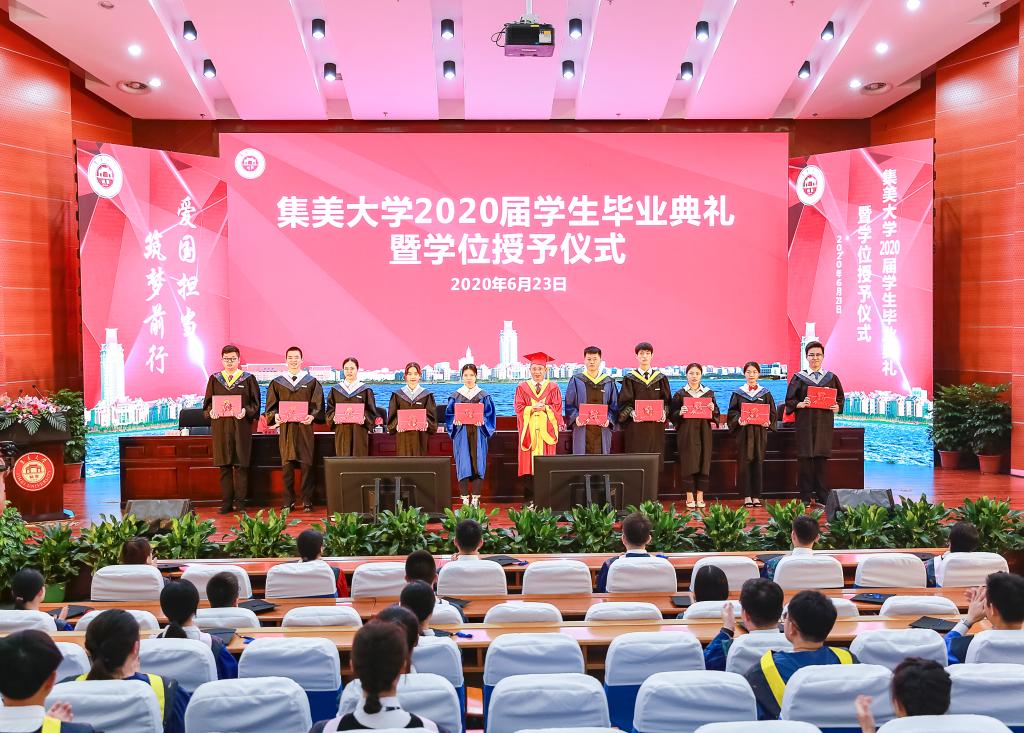 典礼上,各会场和身处祖国各地的毕业生以朝气蓬勃的姿态庄严宣誓,表达了“有荣母校,矢志报国”的青春誓言。三位毕业生代表现场分享了关于“青春与梦想”的故事,表达了对母校、老师和同学的感谢与眷恋,表示将不惧风雨、勇挑重担,让青春在党和人民最需要的地方绽放。杰出校友、旅日侨胞刘丹蕻通过视频的方式,讲述疫情期间护送“钻石公主”号邮轮上的中国同胞回家的逆行故事,勉励毕业生牢记“诚毅”校训,珍惜青春年华,不负伟大时代,为集大争光。