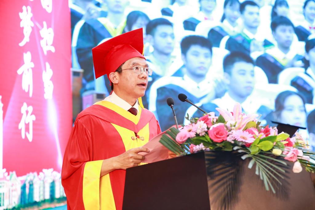 上午10:00,毕业典礼在线上线下同步开始,奏唱《中华人民共和国国歌》。校党委书记沈灿煌为优秀毕业生代表颁发荣誉证书。校党委副书记、校长李清彪做题为《心存敬畏知守慎身行正道稳致远》主题致辞,表达了对全体毕业生的依依不舍和深深祝福,他与毕业生们分享“心存敬畏,身行正道”的人生体悟,鼓励同学们要敬祖孝宗兴家国,爱岗精业勇担当;敬奉天道行知止,恪守人道事有度。他希望毕业生们在漫漫人生旅途中做到遵纪守法、遵德守礼、守住良心,在国家和民族需要的时候,有挺身而出的勇气和担当,有逆行而上的胆略和能力,保护民族、守卫家园。