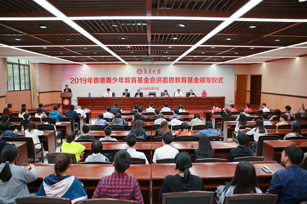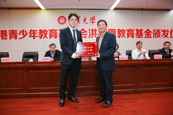 施教斌和香港雅达集团董事长王为杰分别代表香港青少年教育基金会和洪嘉恩致辞。他们说,香港青少年教育基金会在校设立教育基金,旨在帮助经济困难的学生完成学业,激励香港学生勤奋学习、努力进取,增强香港学生的家国情怀,促进香港青少年到内地交流、求学和就业创业,为推动香港融入国家发展贡献力量。他们勉励广大学子报效国家和社会,尤其是香港学子要发奋图强、立志成才,勇做内地和香港沟通的纽带,做好“一国两制”的实践者和维护者,为祖国的发展再立新功。