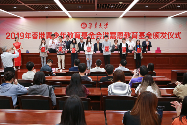 5月8日下午,我校在尚大楼103会议室举行2019年香港青少年教育基金会洪嘉恩教育基金颁发仪式。厦门市委统战部副部长蔡林娜,香港青少年教育基金会创会主席施教斌一行,校长李清彪、副校长曹敏杰出席了颁发仪式。学校有关部门负责人、教育基金获奖受助同学、全体香港学生参加了仪式。仪式由校党委副书记洪文建主持。