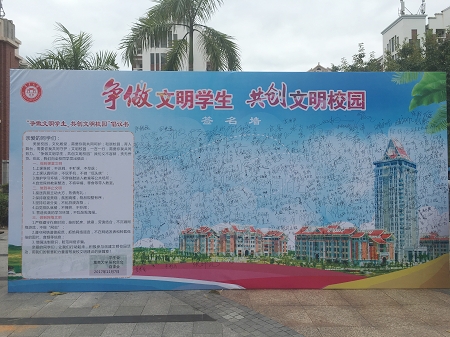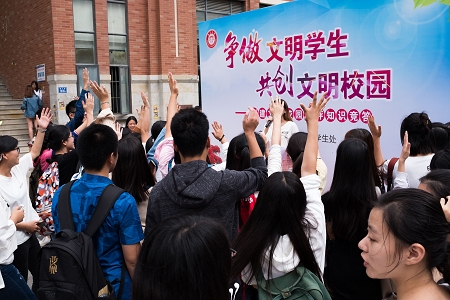 文明校园迎评知识竞答活动现场,人潮涌动,同学们踊跃竞答,互动热烈,在轻松愉快的氛围中加深了对社会主义核心价值观、校史校训、文明礼仪等大学生应知应会内容的理解和认同。校学生会、研究生会和自律会等学生组织,向全校同学发出“争做文明学生,共创文明校园”倡议。广大学生踊跃响应“争做文明学生,共创文明校园”倡议,在“签名墙”上纷纷留言,他们用自己的实际行动,表达了积极参与文明校园创建的热情。