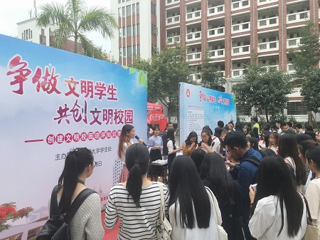 11月8日,我校在新校区万人餐厅门口广场举办“争做文明学生,共创文明校园”主题教育宣传活动。