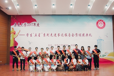 现场揭晓了“学习之星、科创之星、实践之星、志愿之星和自强之星”获奖名单。“学习之星”代表李嘉廉、“科创之星”代表齐锋同台用幽默生动的话语分享了他们学习、科创的心得。2017年学生最喜爱的教师、工商管理学院尤成德,水产学院辅导员张艳娇分别讲述了“实践之星”和“志愿之星”践行嘉庚精神和社会主义核心价值观的故事。“自强之星”代表梁昉炜分享了他自强自立的奋斗经历。最后,颁奖典礼在《集大抒怀——喜庆党的十九大》朗诵中落下帷幕,集大学子庄严地宣誓:将肩负起责任,奋力拼搏,再辟鸿蒙,续写集大新辉煌。