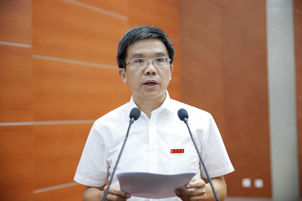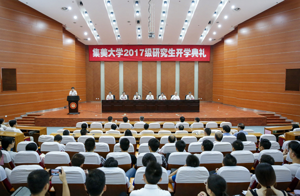 校长李清彪发表讲话。他代表学校党政领导和全体师生员工对445名2017级研究生的到来表示欢迎和祝贺。他结合自身的学习研究经历,向新生们提出三点希望:一是要有敢立潮头唱大风的志向,敢于站上时代潮头,敢于走到学科发展的最前沿,敢于面对错综复杂的社会问题,去寻找突破口,解决新问题,去攻克科研的难关,去探索前人没有走过的道路,争取学术上取得新发现和新突破。二是要有守得云开见月明的定力,始终都保持着刚进校时的这份初心,怀有不懈追求科学精神的信念,以勤为径,以苦为舟,心无旁骛地在知识的海洋中乘风破浪,向着成功的彼岸勇往直前。三是要有抱朴守正求真知的操守,不断提高自身的学术修养,坚守学术良知,恪守学术道德,以求真务实、勤奋刻苦为荣,以弄虚作假、不劳而获为耻;以抱朴守正、谦进诚实为荣,以追名逐利、随波逐流为耻,始终秉持对学术的敬畏之心,在学问精进的同时,不断追求人格的完善。