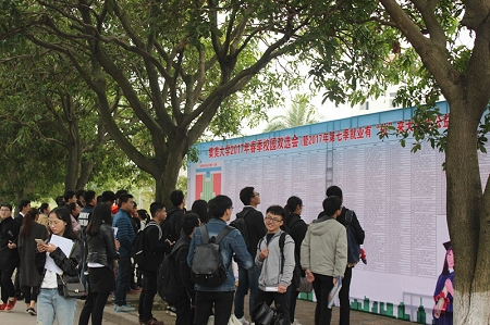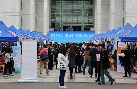 3月22日,集美大学2017届毕业生春季校园双选会在嘉庚图书馆前举行,厦门国贸集团、福信集团、福州港务集团、东阿阿胶股份有限公司等来自省内外328家企业参加双选会,大会共为2017届毕业生提供5323个就业岗位,需求专业覆盖了计算机类、机械类、电子通信类、经管类、教育类、交通运输类、生物食品类、外语、文学、法学等我校大部分专业。其中,计算机类、机械类、电子通信类、经管类等专业需求较为集中。双选会共吸引了省内外院校近万名毕业生前来应聘。大会同时设有简历诊断及就业咨询服务区、大学生征兵咨询点等服务窗口,分别由企业人力资源专家、学校就业指导老师、学校征兵工作站工作人员等为毕业生现场提供咨询和指导,受到毕业生们的广泛欢迎。双选会现场气氛热烈,效果良好。