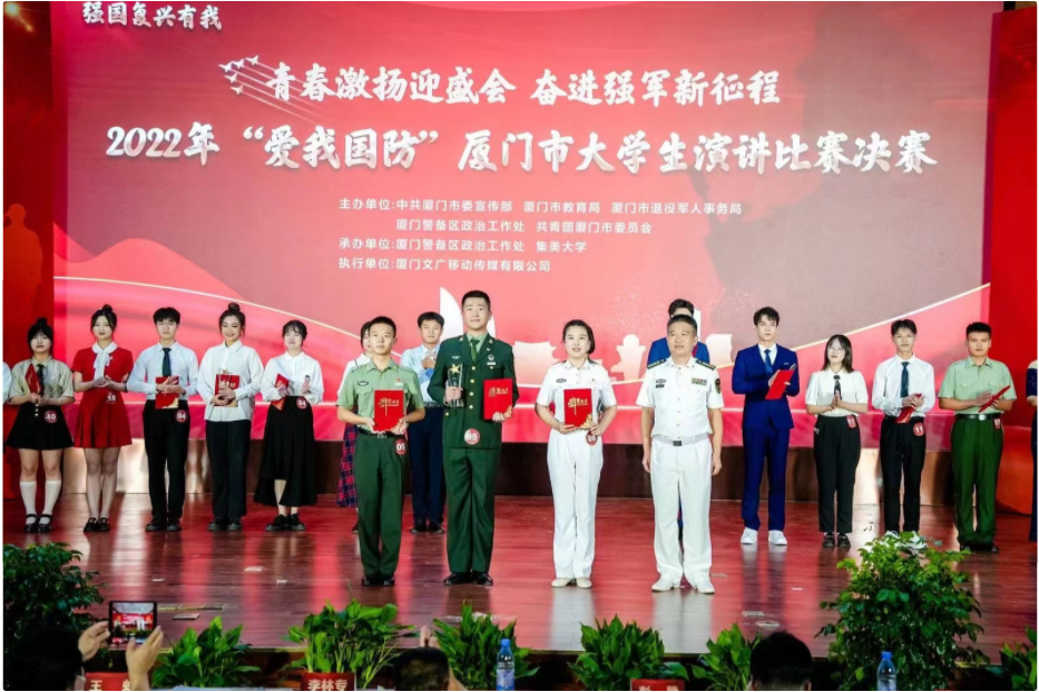 为进一步增强大学生国防观念,激发青年学子赓续红色血脉、热爱人民军队、尊重崇尚英雄、矢志报国强军的政治热情,10月14日下午,以“青春激扬迎盛会,奋进强军新征程”为主题的2022年“爱我国防”厦门市大学生演讲比赛决赛在我校举办,经过激烈的角逐,我校退伍学生杨开焱、赵若虓、杜思瑶的演讲《祖国,我们在战位报告!》荣获大赛第一名,退伍学生邓采霞的演讲《我是特种兵》荣获大赛第二名。