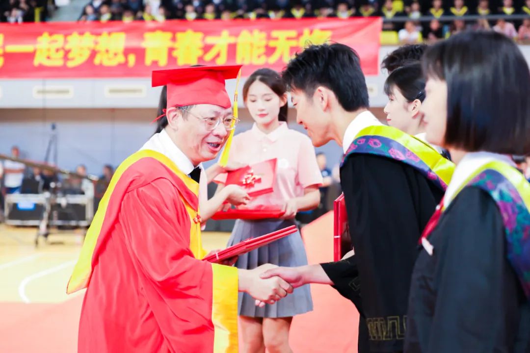 校党委书记沈灿煌为优秀毕业生代表颁发荣誉证书,校领导为毕业生代表颁发毕业证书,为2023届校友信息员代表颁发聘书,副校长曹敏杰宣读2023届研究生、本科生学位授予决定和优秀毕业生表彰决定。