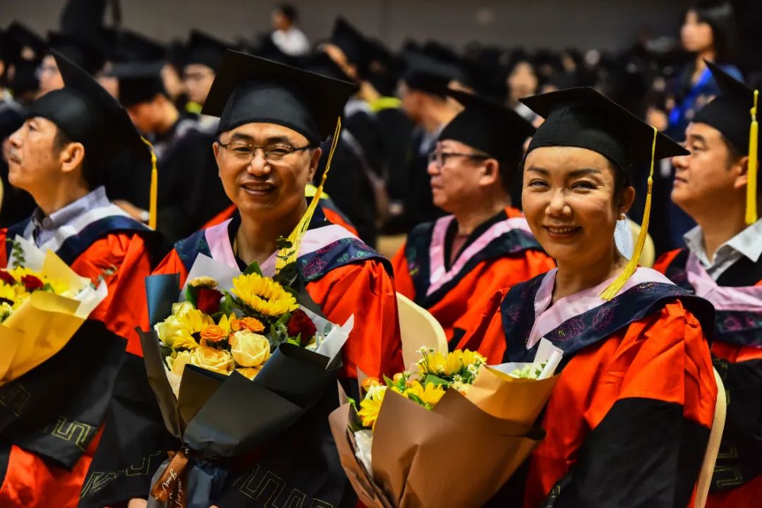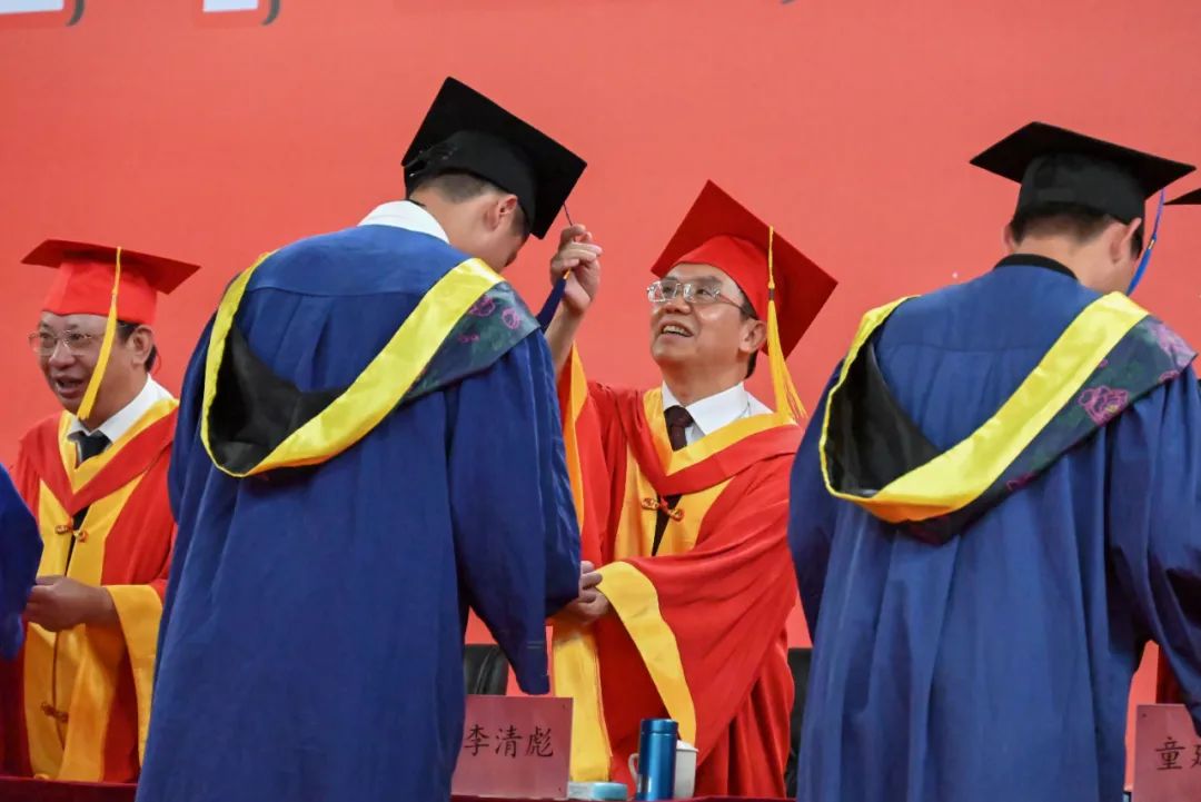 在学位授予仪式上,校院领导、校学位评定委员会委员为全体毕业生拨正流苏,颁发学位证书并合影留念。