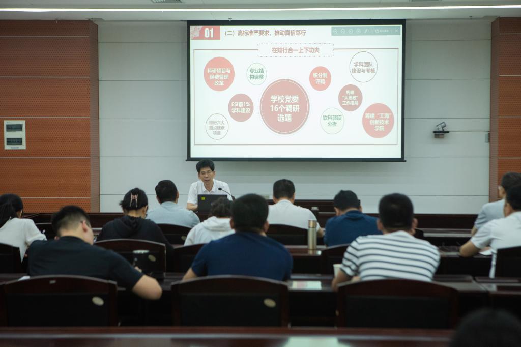洪文建结合学校思想政治工作实际,进一步阐释了高校要把立德树人作为中心环节,把思想政治工作贯穿教育教学全过程这一根本遵循,指出在学校思想政治工作中,要牢记“国之大者”,提高政治判断力、政治领悟力、政治执行力;要拿准“总钥匙”,增强推进工作的科学性、预见性和创造性;要抓住“质量”这个关键着力点,努力开创育人工作新格局。他强调,广大党员师生要深入学习贯彻习近平新时代中国特色社会主义思想和党的二十大精神,全力推动学习贯彻习近平新时代中国特色社会主义思想主题教育走深走实,牢记嘱托,踔厉奋发,勇毅前行,着力构建和完善与“双一流”建设相适应的大学生思想政治工作体系,加快推进“工海”特色更加鲜明的一流大学建设,为建设教育强国贡献集大力量。