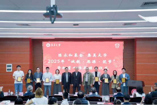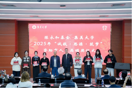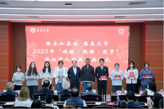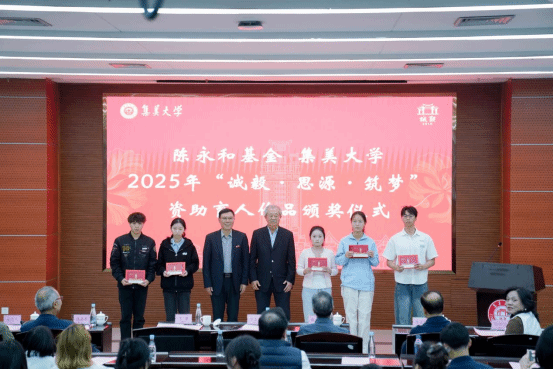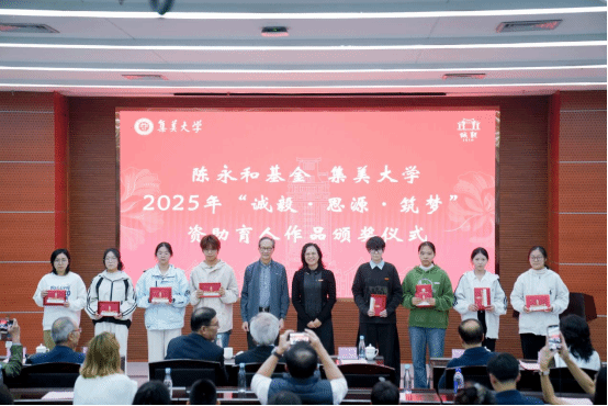 11月18日下午,2025年“诚毅·思源·筑梦”资助育人作品颁奖仪式在尚大楼108会议室隆重举行。集美大学党委常委、副校长王建,陈文确陈六使后裔—常务校董、新加坡陈永和控股有限公司董事长陈嘉谋及魏达人一行,集美区侨联主席陈群英、副主席王昌泽,我校学生处处长张挺,国际合作交流处处长、校教育基金会秘书长陈雅珍以及各学院获奖师生代表出席。颁奖仪式由校办公室主任、校基金会理事长黄海宏主持。