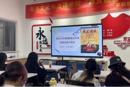 7.海洋文化与法律学院戏文专业每周不定期举办经典电影分享会。专业老师精选了多部不同风格和时期的经典影片进行展映,涵盖了艺术片、剧情片、纪录片等多种类型。从《楚门的世界》的深刻叙事到《燃烧女子的肖像》的独特视角,每一部影片都为同学们带来了一场视觉与心灵的双重盛宴。在观影结束后的交流环节,同学们从影片的剧本结构、人物塑造、导演手法、摄影技巧等多个专业角度展开深入讨论。分享活动为戏文专业的学生提供了一个学习与交流的平台,加深了他们对影视艺术理解,拓宽了他们的艺术视野,为其专业学习与创作积累经验。